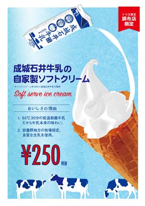 1つは、同社オリジナル「成城石井牛乳」を使ったソフトクリームだ。この牛乳は、安曇野地方の少数の酪農家限定で生産している。一般的な牛乳は高温で数秒間の殺菌をするが、この牛乳は65℃で30分と時間をかけて低温で殺菌をする。そうすることで、生乳本来の味が楽しめる。これに同社が直輸入している、アルフォンソマンゴーのピューレを25%使って、濃厚なマンゴーソフトとミックスさせた。ほかに、コーヒーやコーラに浮かべたフロートなどがある。