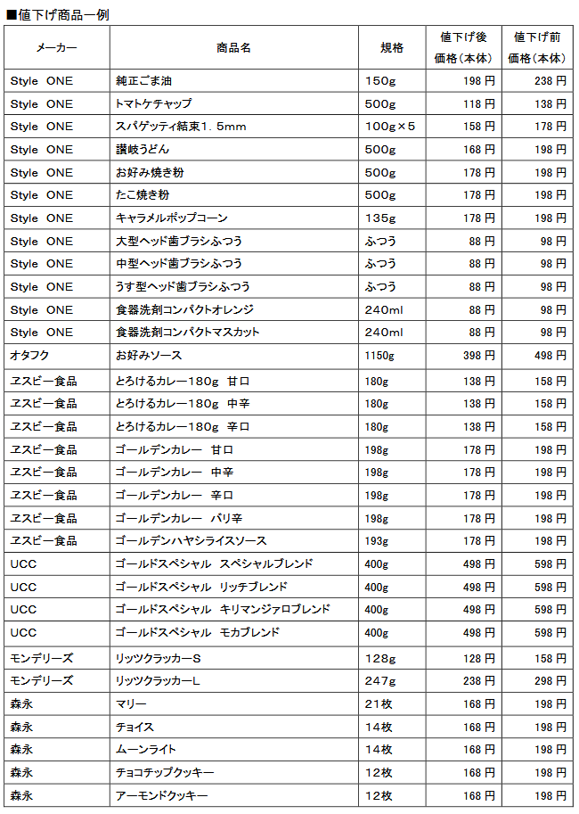 値下げされるのは、フジのプライベートブランド「スタイルワン」を含む一般食品、菓子、日用品など200品目で、さらに値下げ品目のラインナップが拡がる。
