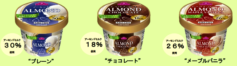 種類はプレーン、チョコレート、メープルバニラの3種類。すべて105㎖で本体価格158円。アーモンドミルクの使用量はプレーンが30%、チョコレートは18%、メープルバニラは26%となっている。
