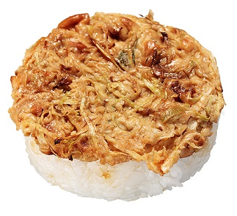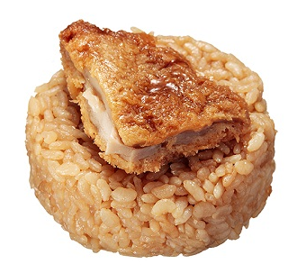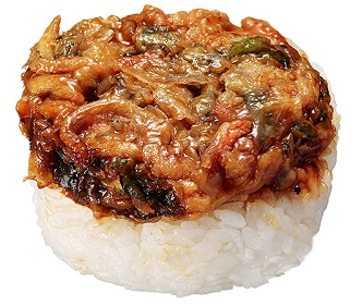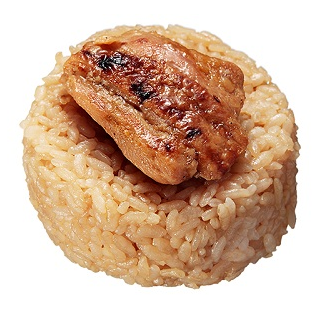 やきとりおにぎり(108円)は、炭火風味のやきとりを、味付けごはんの上にのせた。