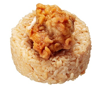 甘酢唐揚おにぎり(108円)は、唐揚に甘酢ソースをからめた。