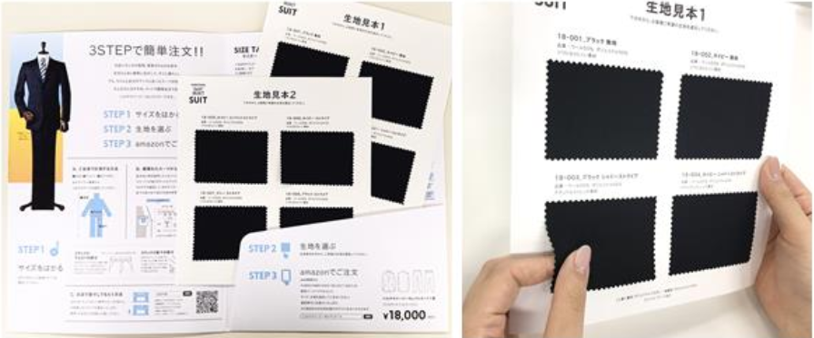 これは、サイズカタログと生地見本をお客に届け、お客は実際の生地を確かめながら、インターネットでスーツを注文するという新しい販売方法である。新しいスーツの買い方提案になる。スーツ購入のためにお店に行くのが面倒だ、接客を受けるのが苦手だ、簡単にインターネットでスーツを購入したい、といったお客の声に応える。