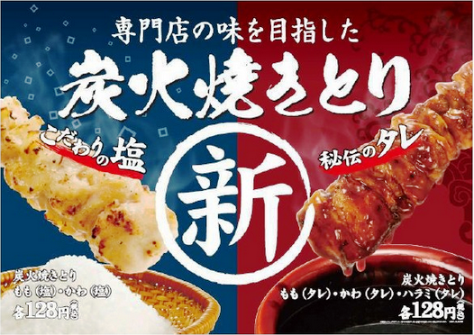 商品は、「炭火焼きとり ももタレ」「炭火焼きとり もも塩」「炭火焼きとり ハラミタレ」「炭火焼きとり かわタレ」「炭火焼きとり かわ塩」(すべて税込128円)。