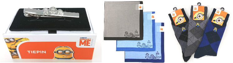 タイバー(タイクリップ)は、シルバープレートにデボス加工でミニオンを刻んでいる。またハンカチ、靴下は生地の色味をベーシックなカラーにして、ワンポイントとしてミニオンをデザインした。スーツスタイルやビジネスカジュアルにもコーディネートしやすいデザインだ。自分用だけでなくギフトにも最適の商品として訴求していく。