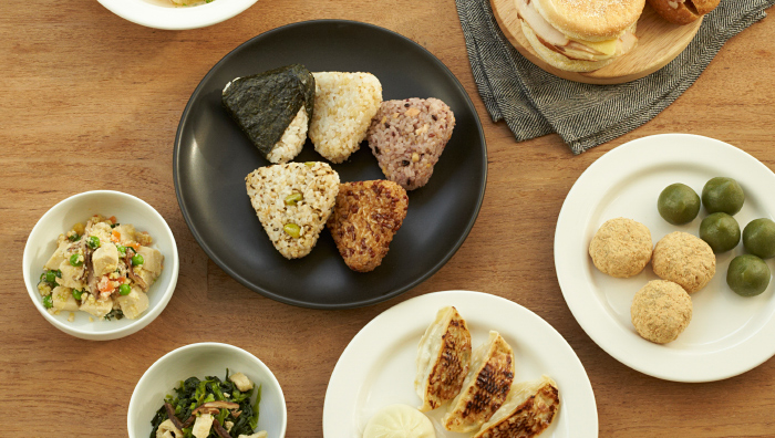 ⑷発芽玄米ごはんの塩おにぎりや豚角煮の中華ちまき、キンパ(韓国風のりまき)などの「素材を生かした世界のごはん」(390円、450円、490円)12アイテム。