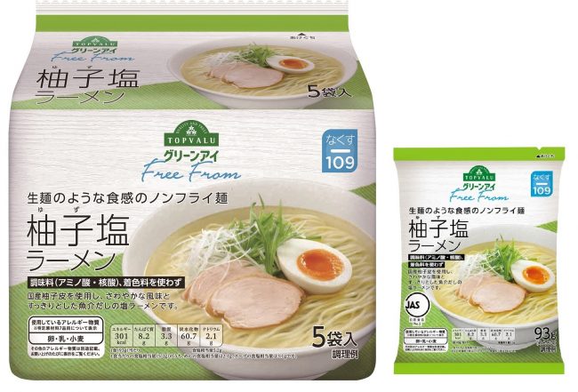 イオン(株)は9月19日(水)に、「トップバリュ グリーンアイフリーフロム袋ラーメン」2品目(柚子塩・魚介醤油)を販売した。全国の「イオン」「イオンスタイル」「マックスバリュ」など、約2000店舗で扱う。