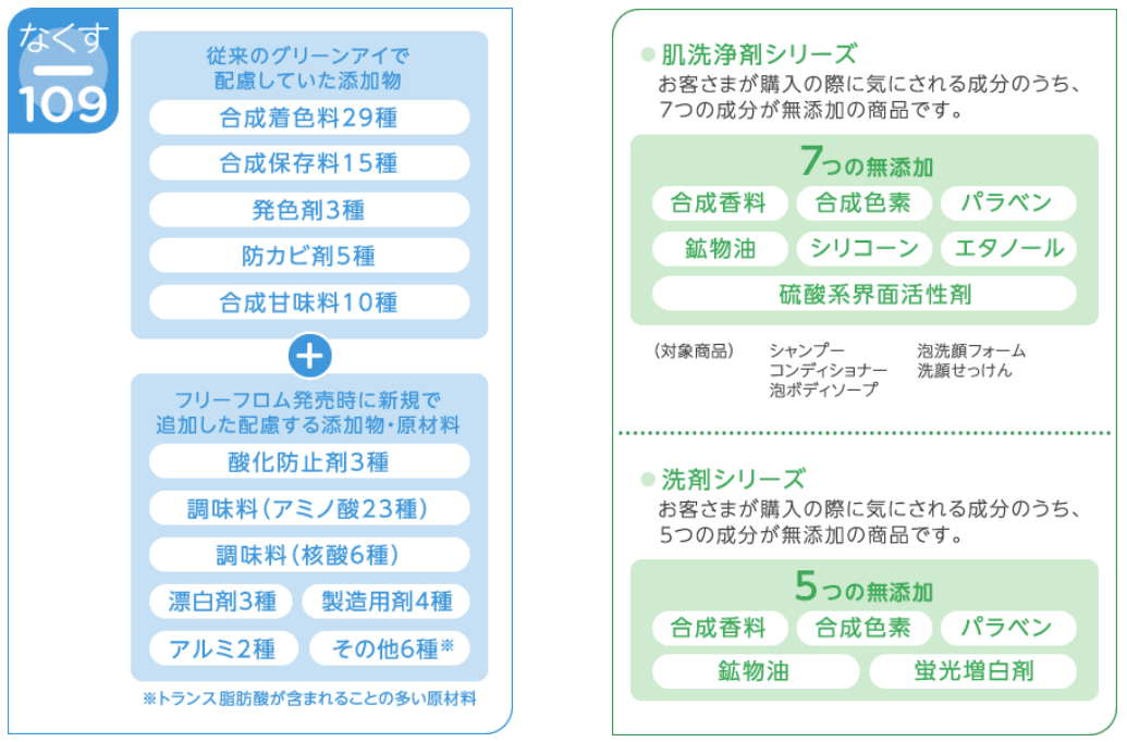 グリーンアイフリーフロムは、お客が商品を購入する際に気にする添加物、原材料の中の109種類の成分に配慮したシリーズだ。フリーフロムとは「存在しない」「ない」という意味。食品では109種類だが、肌洗浄剤では7つ、洗剤では5つの成分や添加物・原材料の使用に配慮した商品がある。
