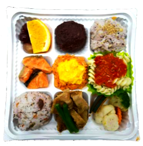 アスリート弁当は、812キロカロリー。梅ちりめんごはん、雑穀米、オムライス、トマトと野菜のパスタ、豚しょうが焼き、鮭塩焼き、温野菜(ブロッコリー・ニンジン・カリフラワー・カボチャ)、フルーツ(オレンジ・ブドウ)、ミニおはぎ。