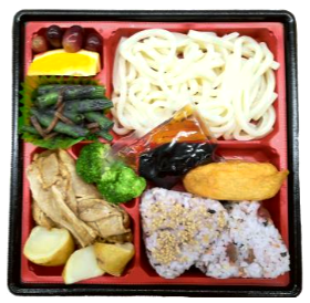 GoGo弁当は、879キロカロリー。梅ちりめんごはん、雑穀米、いなり寿司、うどん、豚しょうが焼き、インゲンのごま和え、蒸しじゃがいも・ブロッコリー・フルーツ(オレンジ・ブドウ)。
