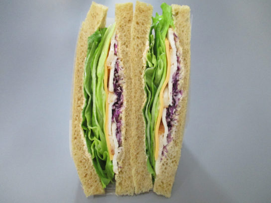 全粒粉を配合したサンドイッチ用の食パンに、野菜マヨソースを塗り、スーパー大麦、ローストチキン、チェダーチーズ、グリーンリーフ、レタス、紫キャベツを具材とした。スーパー大麦のぷちぷちとした食感が楽しい健康サンドイッチだ。