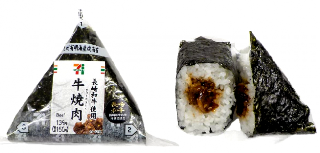 「手巻おにぎり牛焼肉(長崎和牛使用)」は150円。長崎県産の「長崎和牛」を中具に使用したおにぎり。長崎和牛のバラ肉を地域に馴染みのある甘辛いタレで味付けした。