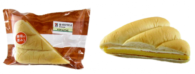「白いカステラサンド」は148円。卵風味のカステラ生地をサンドすることで、ふんわり・しっとりの食感が楽しめる。クリームは、砂糖のジャリジャリとした食感を加えて、カステラのザラメを表現した。