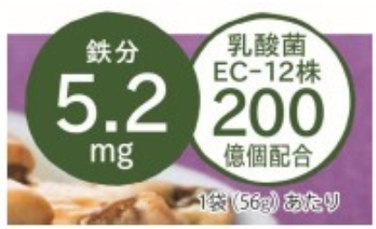 たとえば、「一日不足分の鉄分が補えるちいさなオールレーズン」(税込118円)は、1袋56g当たり、鉄分5.2mg、乳酸菌EC-12株200億個が摂取できる。こうした乳酸菌や食物繊維などの栄養分を緑色の円と白い円のアイコンで表してパッケージに記載する。
