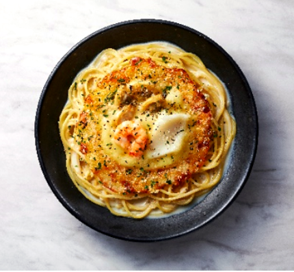 4種のチーズとシーフードのとろ~り焼チーズパスタは、あさりの旨みを加えたホワイトソースと海老、いか、あさりをトッピングしたパスタに、モッツアレラ、ゴーダ、チェダー、パルメザンの4種のチーズを加えている。