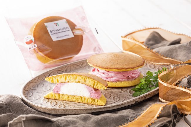 セブン‐イレブンの和菓子で人気の「生どら」と、昨年の「いちごの日」に販売した「苺モンブラン」を組み合わせた「苺クリーム&ホイップ生どら」 。同社の専用工場で銅板を使って焼き上げた生地は、隠し味に醬油等を加えることで和の風味を味わえる仕立てとなっている。発売日は1月1日(火)で199円。