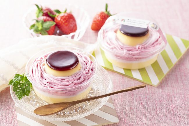 カスタードプリンの周りに甘酸っぱい苺クリームをモンブラン絞りにしたプリンパフェ。発売日は1月3日(木)で297円。