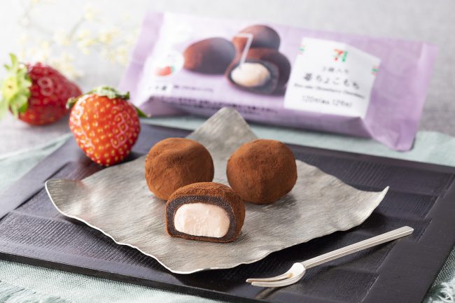 やわらかい一口サイズの餅で苺の濃縮果汁を加えた苺風味のチョコレートを包み、ココアパウダーをまぶした仕立てである。発売日は1月8日(火)で129円。