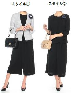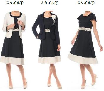 ジャケット2着に、上品なフレアシルエットのレトロな感じのワンピースがついたセット。ノーカラージャケットには、ポケットにパールの飾りがついていて、ワンポイントになっている。(本体価格は1万8800円、色は黒・薄茶の2種類、サイズは7~15号)