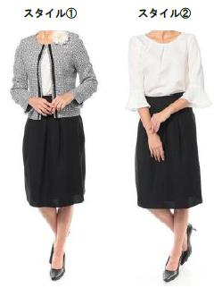 プリーツ加工のグログランテープを使用したジャケットは羽織るだけでエレガントな印象になる。袖口が広がったブラウスは、それだけでも華やかに着こなすことができるうえ、シンプルなので普段着としても着回せる。スカートはウエストがゴムになっているため、長時間座っていても苦しくなりにくい。(本体価格は9800円、色は薄黒・濃青の2種類、サイズは9~15号)