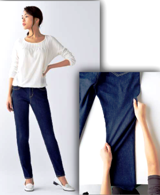 商品はストレッチ素材を使用しているため、カラダにフィットしやすい。さらに、膝の位置を高めに設計していることで足のラインが美しく見える。