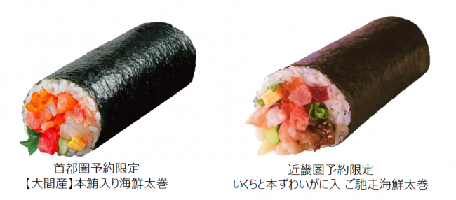 首都圏では希少価値の高い“大間産”の本鮪をメインに13種類の海鮮具材が入った「【大間産】本鮪入り海鮮太巻」(本体価格2380円、以下同じ)、「北極圏生サーモン入り 海鮮サラダ太巻」(1280円)、「国産本鮪三昧太巻」(2780円)、「国産黒毛和牛太巻」(1780円)の4種類。