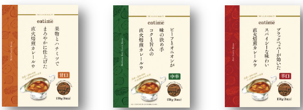 ⑵「果物とハチミツでまろやかに仕上げた直火焙煎カレールウ(甘口)」「ビーフとオニオンが味の決め手 コクと旨みの直火焙煎カレールウ(中辛)」「ブラックペッパーが効いたスパイシーな味わい 直火焙煎カレールウ(辛口)」(各150g、288円)