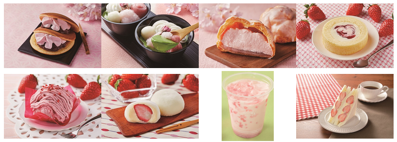 下段左から:「濃苺モンブラン」295円、「Uchi Café×八天堂 かすたーど苺大福」185円、「MACHI café 桜ゼリーラテ」260円、「八天堂監修 かすたーど苺」320円