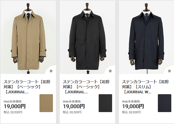 ポリエステル100%のシンプルなステンカラーのスプリングコートで、色はネイビー、黒、ベージュの3種類。本体価格は1万9000円。サイズはS~LLを揃えた。