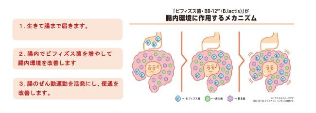 「機能性表示食品」とは、事業者の責任で、科学的根拠を基に商品パッケージに機能性を表示するものとして消費者庁に届け出られた食品を指す。商品には腸内環境改善に役立つビフィズス菌「BB-12TM(B.lactis)」を使用している。この「BB-12TM(B.lactis)」は、デンマークのクリスチャン・ハンセン社の保有する菌で、プロバイオティクスとして世界的に利用されている乳酸菌だ。胃酸に耐えて、生きて小腸・大腸に到達することができるため、腸内環境の改善に役立ち、お通じを改善する効果が得られる。100g当たり10億個のビフィズス菌を配合し、“腸活”をサポートする。