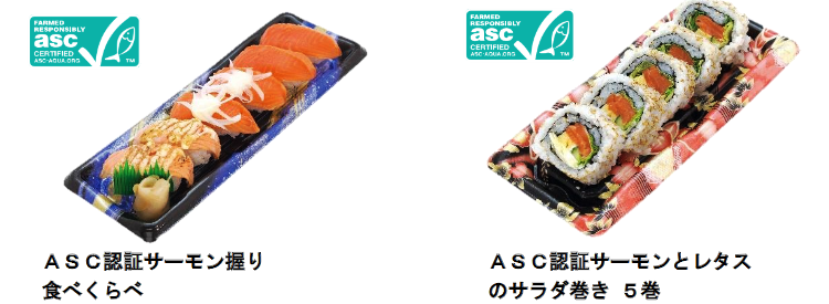 切り替える原料は、ASC認証サーモントラウト(チリ)、ASC認証サーモン焼ハラス(ノルウェー)、MSC認証いくら醤油漬け(アメリカ)、MSC認証ほたて貝柱(北海道)、MSC認証甘えび(グリーンランド・カナダ)MSC認証かれいえんがわ(グリーンランド・カナダ)の6種類。