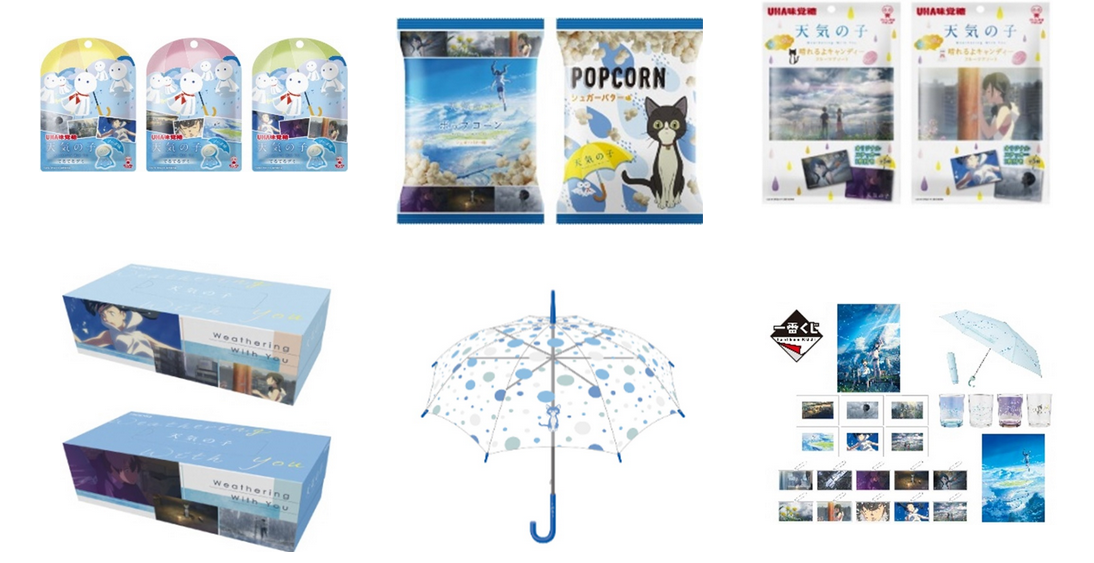 てるてるグミ(全3種、税込価格127円、以下同)、ポップコーン シュガーバター味(全2種、160円)、晴れるよキャンディ(全2種、216円)、ボックスティシュ(全2種、220円)、ビニール傘59cm(1280円)、一番くじ 天気の子(1回、650円)の6品。