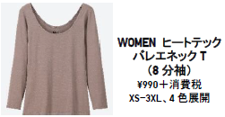 ウィメンズでは、2018年にオンラインのみで展開していた「ヒートテックバレエネックT(8分袖)」を店舗でも販売する。前後のネックラインが大きく広がったデザインは、胸元や背中が開いた華やかな装いのインナーとして適している。
