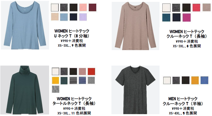 カラーバリエーションが増えたのは、ウィメンズの「ヒートテックタートルネックT(長袖)」「ヒートテックUネックT(8分袖)」「ヒートテッククルーネックT(長袖)」、メンズの「ヒートテッククルーネックT(半袖)」の4商品で、いずれも税抜き価格990円。インナーとしてだけでなく、トップスとしても着回すことができるコーディネーㇳを提案していく。