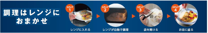 今回新たに発売する「トップバリュ レンジ調理セット」は、レンジで加熱すると袋の内部でスチーム調理され、そのまま料理ができあがる冷凍ミールキットだ。魚に触れずに袋のまま電子レンジで調理をするので、魚のにおいも気にならず、後片付けも簡単だ。また解凍などの手間がなく、冷凍のまま加熱するため、魚の凝縮されたうま味とふっくらとした食感が楽しめる。