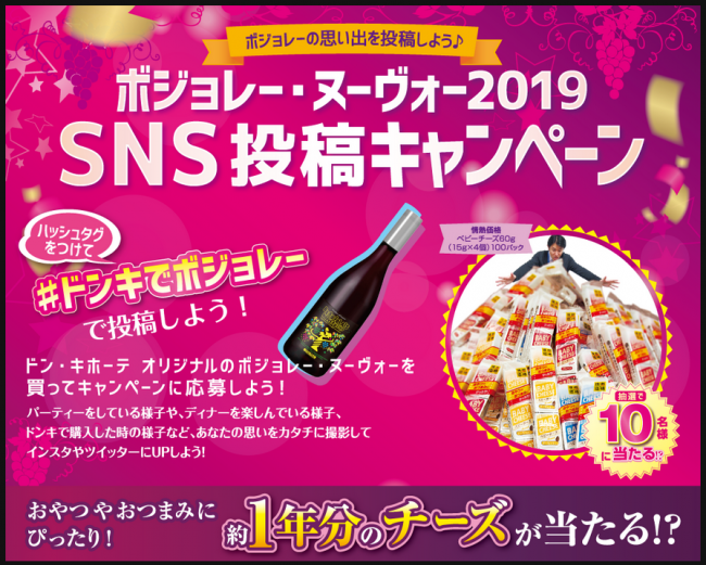 また解禁日の11月21日(木)から12月1日(日)にハッシュタグ“♯ドンキでボジョレー”をつけて、購入商品が写っている様子などの写真を、飲んだ感想とともにSNS(ツイッター、インスタグラムのいずれか)に投稿した人の中から、抽選で10名に約1年分のチーズが当たるキャンペーンを展開する。SNSキャンペーンによって口コミ拡販を狙うという作戦だ。