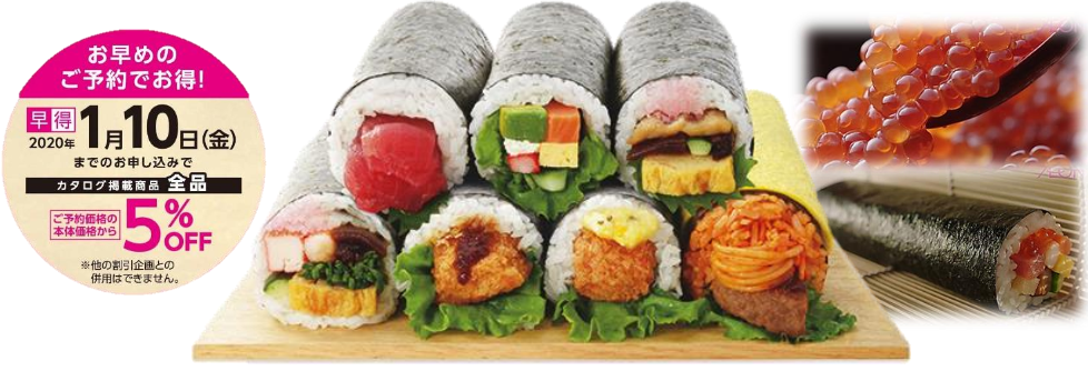また、 “早得価格”を恵方巻では初めて導入する。2020年の1月10日(金)までの予約で、カタログ掲載商品の予約価格からさらに、本体価格の5%分を割引する。事前予約を増やすことで食品ロスを削減する。