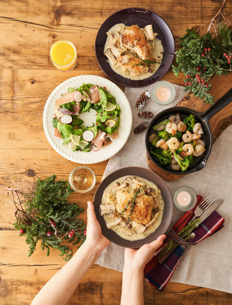 •クリスマスは「タイム香るチキンフリカッセ」「生ハムの彩りリースサラダ」「えびとブロッコリーのアヒージョ」。