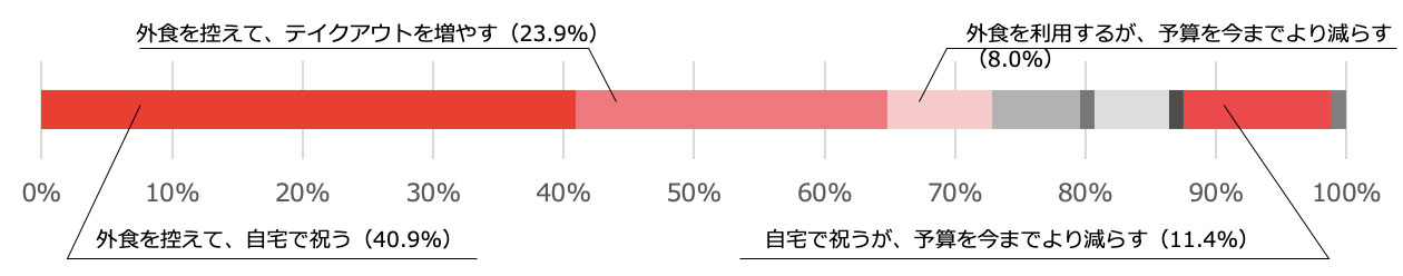 「増税の影響」については、73.9%が「増税の影響で食費を減らそうと思う」、41.1%が「昨年と比較して、クリスマスの食卓にかける金額を節約しようと思う」と回答した。「節約しようと思う」と回答した人に対して、「どのように節約しますか」と質問したところ「外食を控えて、自宅で祝う」が最も多く40.9%を占めた。