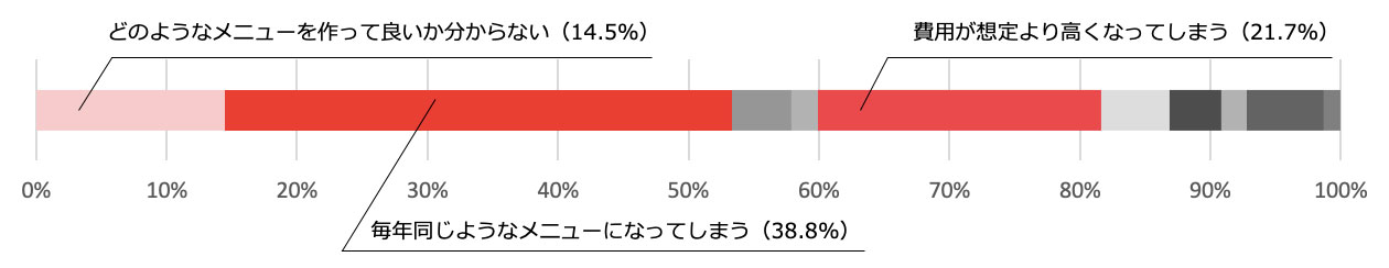 「クリスマスのメニューでの困りごと」については、最も多かったのが「毎年同じようなメニューになってしまう」で、38.8%だった。「費用が想定より高くなってしまう」「どのようなメニューをつくってよいか分からない」が続く。