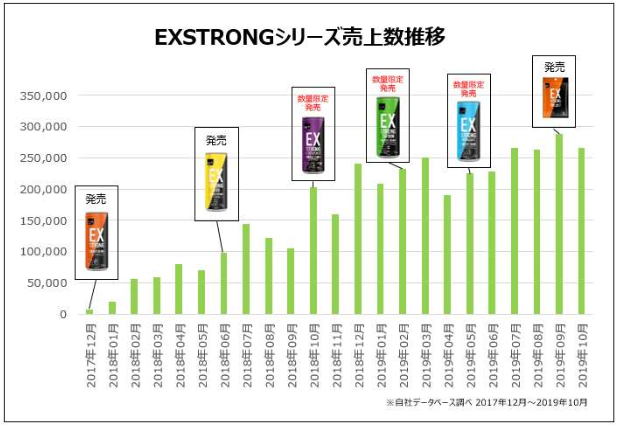 エクストロングシリーズは2017年12月に初代エクストロングエナジードリンクを発売し、2019年10月までに数量限定商品を含む8品を発売して、シリーズ累計売上数は378万個を突破した。