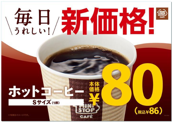 ミニストップ(株)(千葉県千葉市、藤本明裕社長)は2020年1月6日(月)から、MINISTOP CAFÉブランドの挽きたてコーヒー「ホットコーヒーSサイズ」「アメリカンコーヒー(ホット) Sサイズ)」を本体価格80円(税込価格86円)で販売する。味・品質・量は従来のままで本体価格93円(税込価格100円)を値下げするものだ。国内のミニストップ1990店(2019年11月末現在)で提供する。