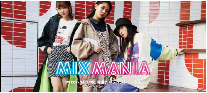 MIXMANIAコレクションのメインターゲットは18歳~24歳の女性ヤング層。エッジを効かせたアイテムを中心に、ウェアだけではなく、シューズやベルトなど、トータルコーディネートができるラインナップとなっている。SNSでもマルチに活躍しているモデルやダンサーなどから、現在の女性ヤング層を代表するミチ、助川恵里佳、曾莹-Bubuの3名をモデルとして起用した。
