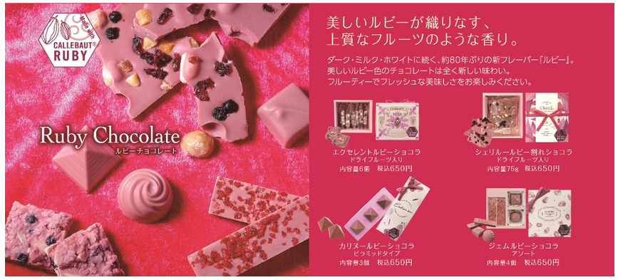チョコレートのグローバルメーカーであるバリーカレボー社(本社、スイス・チューリッヒ)が、10年以上の歳月をかけて開発した。鮮やかなルビー色とフルーティーな香り、酸味が特徴のチョコレートで、着色料やフルーツフレーバーなどを一切使用していない。またバリーカレボー社のベルギー産カレボー®ルビーチョコレート「RB1」を使用した商品には、認定のロゴマークが添付される。
