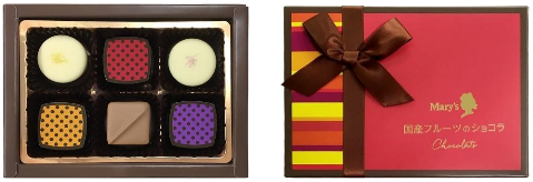 「メリーチョコレート 国産フルーツのショコラ」は、サロン・デュ・ショコラ パリで発表されるチョコレートの格付けで最高位の「ゴールドタブレット」を3年連続で受賞した大石茂之トップショコラティエが監修した。あまおう苺、りんご、瀬戸内レモン、柿、赤ぶどう、みかんの6種類の国産フルーツを使用。それぞれの特長を生かして仕上げた、「フルーツ」を感じられるこだわりのチョコレート。(800円)
