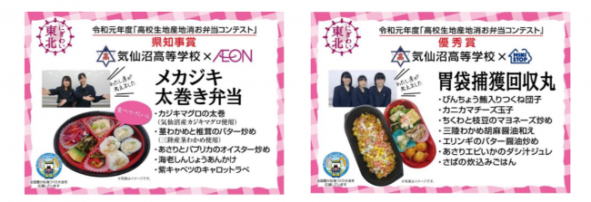宮城県は、地産地消意識の高揚を図るため、「高校生地産 地消お弁当コンテスト」を開催している。地元高校生が地域の食材を活用したお弁当をつくり、その活用方法を競うことで、 地域食材について学ぶ機会とするためだ。2019年度は応募総数80作品(18校)の中から書類審査で選定した9作品を対象に最終審査会を行い、入賞5作品が決定した。その中から、宮城県気仙沼市の「宮城県気仙沼高等学校」の生徒が考案し、県知事賞・ 優秀賞を受賞した弁当2作品を、イオンリテールとミニストップが商品化した。