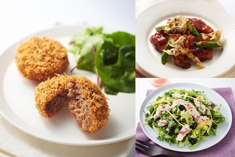 メニューは「亜麻仁の恵み牛のミンチカツ」(1個270円:税込み、以下同)、「塩麹で柔らか 亜麻仁の恵み豚と野菜の甘辛生姜たれ」(100g 432円)、「亜麻仁の恵み鶏のささみと黒豆の梅しそサラダ」(100g 432円)。2月27日(木)~3月25日(水)の期間限定販売だ。