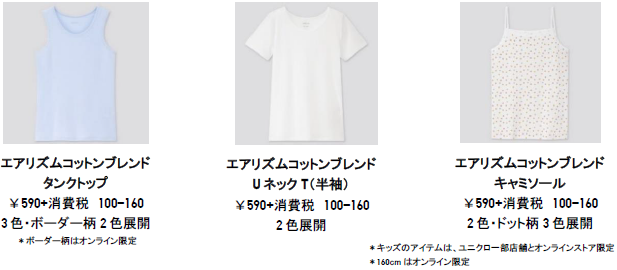 (株)ユニクロ(山口県山口市、柳井正会長兼社長)は、エアリズムのシリーズから「エアリズムマイクロメッシュ」「エアリズムコットン」「エアリズムコットンブレンド」を新たに発売する。