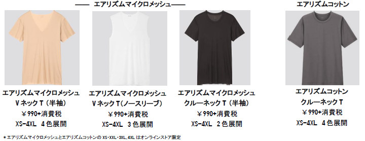 「エアリズムマイクロメッシュ」はVネックT(半袖)、VネックT(ノースリーブ)、クルーネックT(半袖)の3アイテムで、サイズはXS~4XL、カラーは2~4色を展開する。「エアリズムコットン」はクルーネックTで、サイズはXS~4XL、カラーは4色を展開する。価格はいずれも税抜き990円。