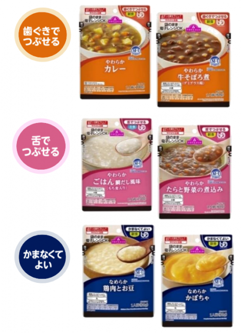 新メニューは、「肉メニューを増やしてほしい」「パンに合う洋風の味がほしい」などの声に応えるもので、やわらかカレー100g、やわらか牛そぼろ煮(デミグラス味)80g、やわらか牛そぼろ煮(和風味)80g、やわらかごはん鯛だし風味(もち麦入り)150g、なめらか鶏肉とお豆80gのの5品。