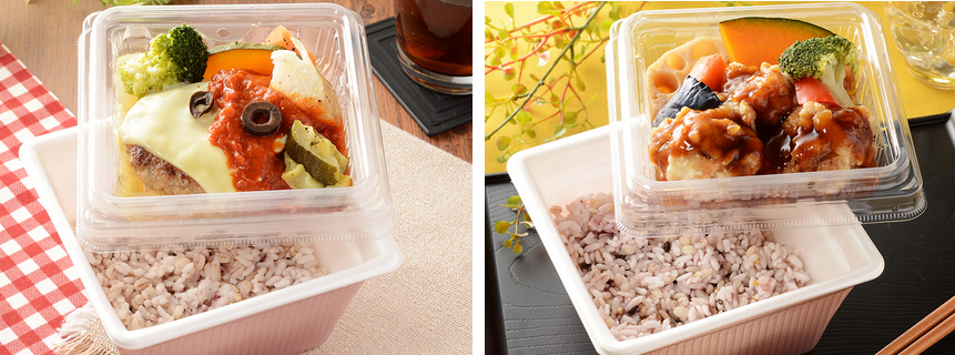 第1弾は「十六穀ごはんのトマトハンバーグ」と「十六穀ごはんの鶏黒酢あん」の2品。どちらも税込498円。
